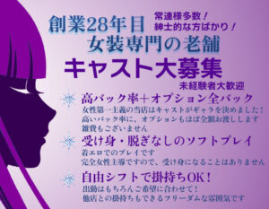 | お仕事内容 | 女装するのが初めてのお客様や女装マニアなお客様に、メイクをして、ウィッグを付け、お洋服や下着類を着せ、女性主導で責める超ソフトなサービスです。下着やヌードになったり、責められたりすることは一切ございません。 |