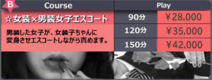 お客様も女性もお互いに女装服。お客様がお選びいただいた衣装を女性も着用し、2人で究極の女装レズプレイ!